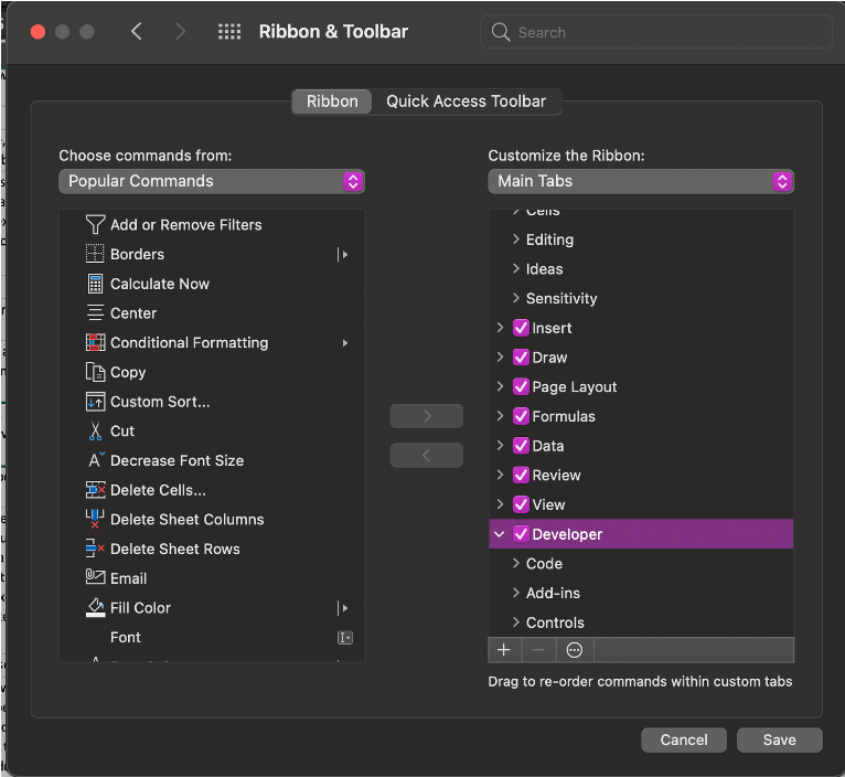 - 2. Under Customize the Ribbon and under Main Tabs, select the Developer check box.