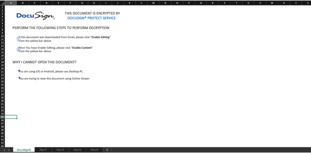 I did not imagine that this type of macros can be used to attack organizations till I got it myself. One day I got an email from an unknown sender with an excel file attached to it. I am an experienced information security analyst, so as usual, I wanted to check that file before I am opening it in the organizational workstation. I sent the email to my private computer and opened it in my virtual lab. It looked like that: