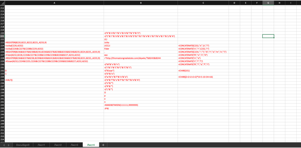 As you see, Excel tells me that macro was disabled. I checked the macro tab. It wasn’t were. So I run the pcodedmp.py and still found nothing. So I decided to unzip the file. Running through unzipped file streams, a found the interesting string “Excel Macro 4.0”. I googled it and found out what it is. I assumed that the first command is behind the picture that I cant move cause the sheet is password protected. I found some VBA script for brute-forcing the excel sheet password and run it. I was able to move the picture and change font color (I thought that as an attacker, I would not like it if someone just sees my macro so that I would change excel font color to white). So after changing the color, I was able to see the command of downloading and executing another file on my station:
